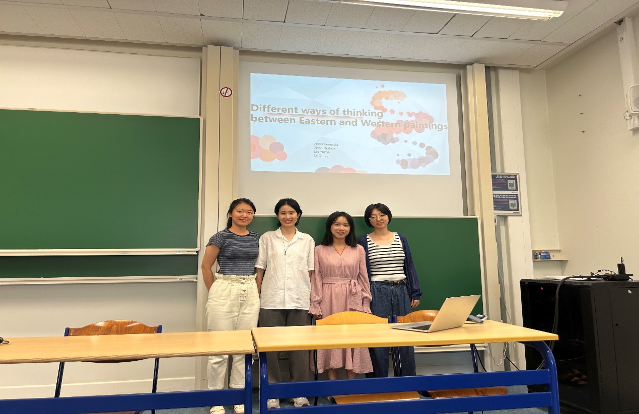 国际课程班采取分组研讨与合作的形式进行交流。同学们以小组为单位,围坐在一起,进行自我介绍和实时互动。最终的课程成果展示方式也采取了小组合作完成并汇报的形式。同学们彼此之间的距离逐渐拉近,本硕博的学制壁垒也被打破,加深了彼此之间的了解,提升了集体协作的意愿和能力。在最后的小组成果展示环节,各组分别围绕中欧音乐艺术节的比较、东西方绘画方式的比较、中欧女性生活方式比较、中法餐饮文化比较、中西“幽默”概念比较、中欧博物馆的比较、比利时的民族国家概念等话题,进行成果汇报,并在老师的指导下,高质量地完成了课程论文。